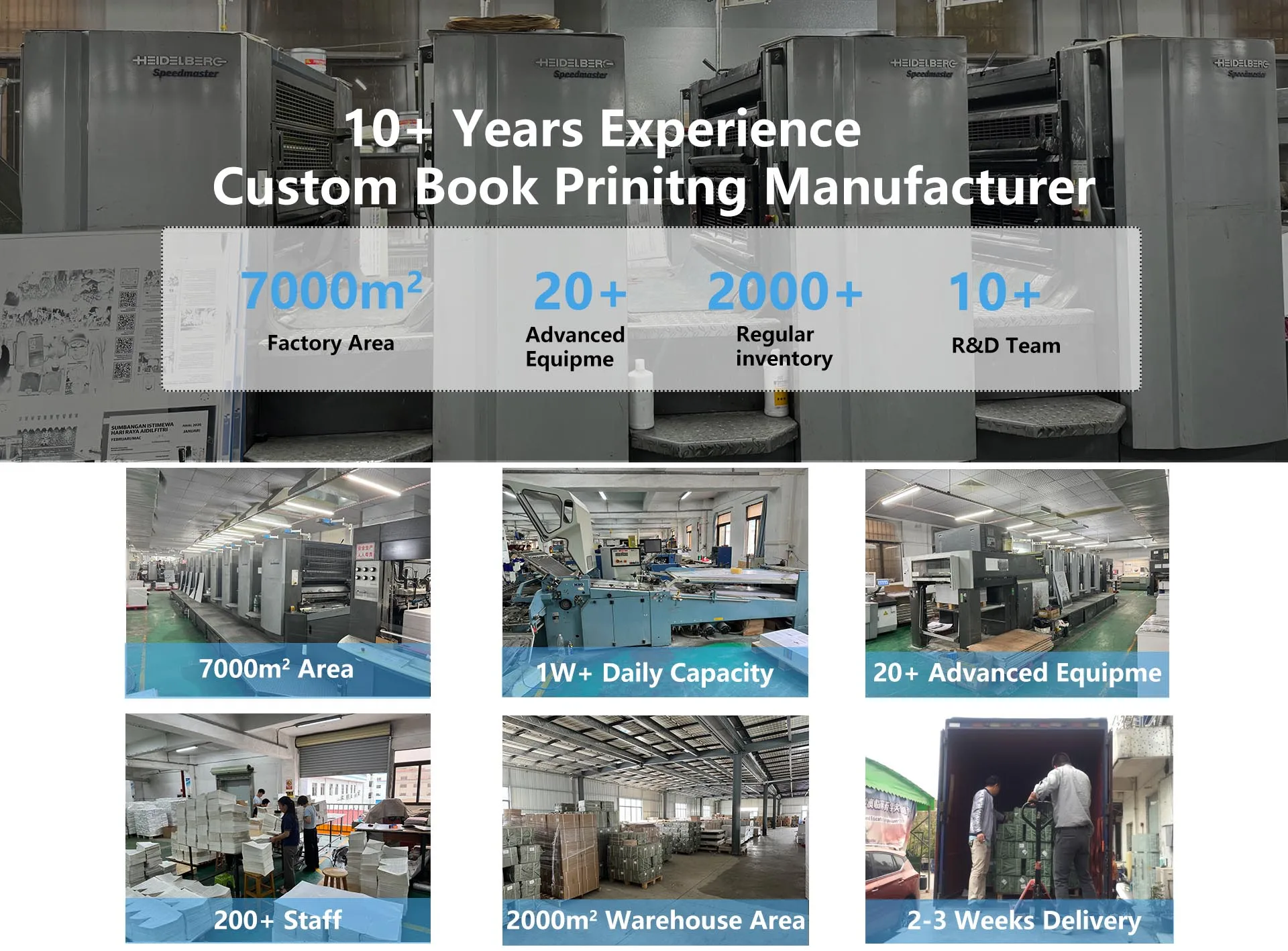 We have multiple imported printing facilities such as Roland printer, Komori, Heidelberg (including monochrome, dual-color, four-color), two + two rotary machine and other related machinery. We also have supporting binding equipment including film lamination machine, paper cutting machine, saddle stitching machine, automatic thread stitching machine, pages folded machine, glue binding machine, bronzing machine, die cutting machine and other related machine. We maintain higher quality standards across all product categories. Strict quality controls are focus on production processes. We hold the tenet of "satisfying the clients with high quality, honesty and mutual benefit". We sincerely welcome friends from China, and abroad to come to us for business and cooperation. If you are interested more about our products and services, inquire today.